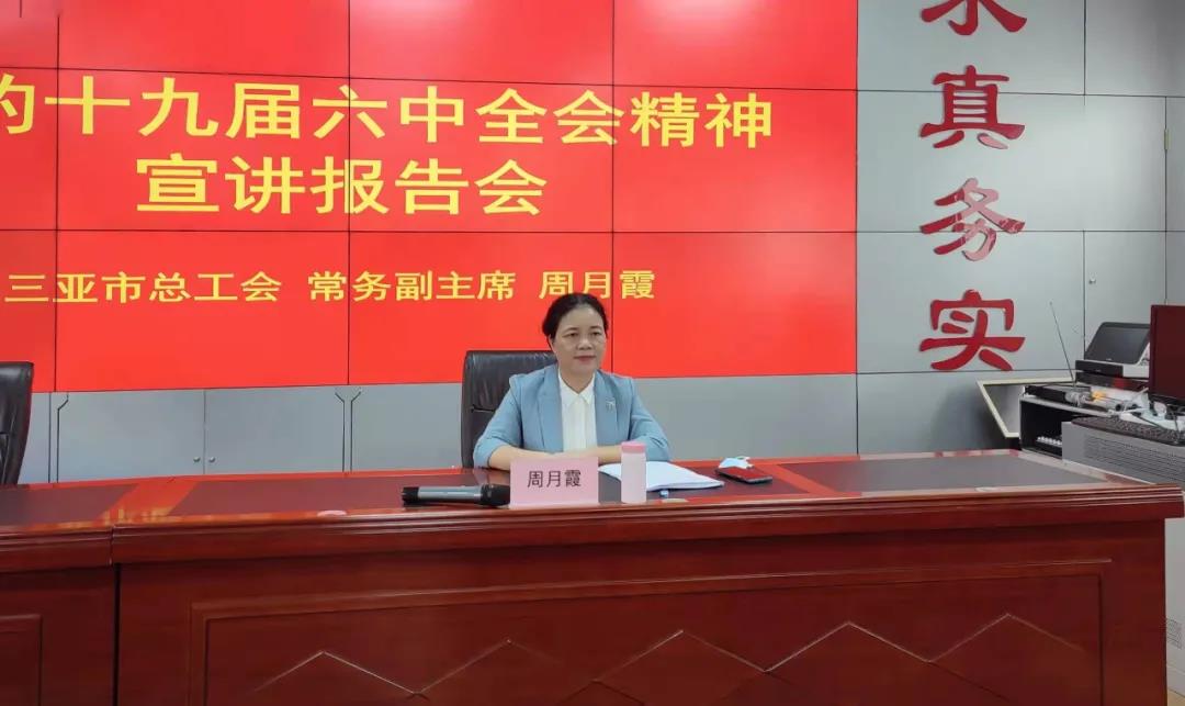 宣講會(huì)上,周月霞從黨的十九屆六中全會(huì)的重大意義、“兩個(gè)”確立、以“四個(gè)”歷史時(shí)期、“三次”飛躍、“十個(gè)”堅(jiān)持等方面,結(jié)合三亞市第八次黨代會(huì)精神和工會(huì)工作實(shí)際,對(duì)全會(huì)精神作了深入淺出的闡釋和全面系統(tǒng)的解讀。她表示,希望大家能夠通過學(xué)習(xí),更好地從黨的百年奮斗中看清楚過去我們?yōu)槭裁茨軌虺晒、弄明白未來我們(cè)鯓硬拍芾^續(xù)成功,激發(fā)奮進(jìn)新時(shí)代、邁好新征程、建功自貿(mào)港的斗志和豪情。